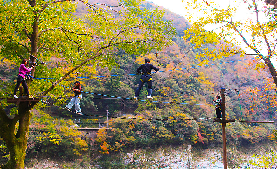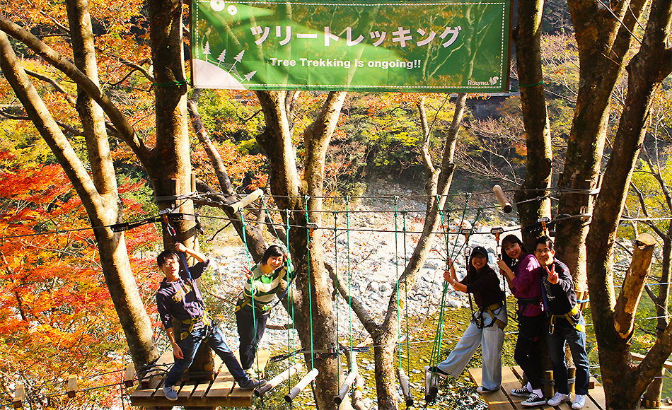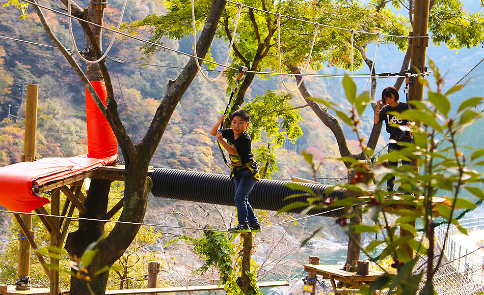 緑の天井のもと林の中の冒険を楽しもう!! 木から木へと滑車の付いたワイヤーにぶら下がって空中飛行したり、木の上に組まれた様々なアイテムをクリアしていきます。 ハーネスと呼ばれる特殊なベルトを装着し安全にお楽しみ頂けます。ツリートレッキングはグループで遊ぶには最高のアクティビティです!